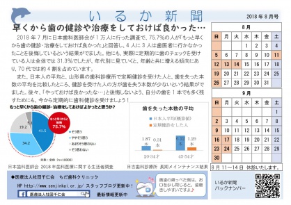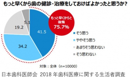 2018年7月に日本歯科医師会が1万人に行った調査で、75.7%の人が「もっと早くから歯の健診・治療をしておけば良かった」と回答し、4人に3人は歯医者に行かなかったことを後悔しているという結果がでました。他にも、実際に定期的に歯のチェックを受けている人は全体では31.3%でしたが、年代別に見ていくと、年齢と共に増える傾向にあり、70代では約4割を占めています。