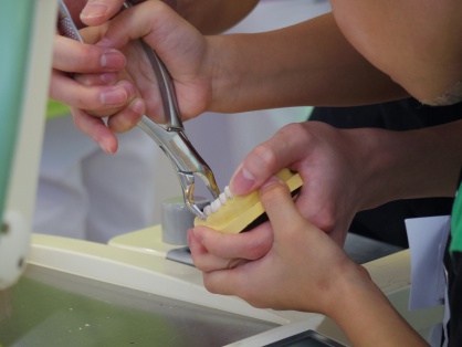 歯の型取り・模型の材料使って指の模型を作る歯科衛生士・歯科技工士体験の他、歯科衛生士の体験では歯石に見立てたマニキュアの除去、歯科医師の体験では歯の抜歯模擬体験、また軽度のむし歯治療の説明も行いました。参加者はそれぞれの体験を真剣に取り組み、また楽しんでくれていました。