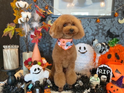 今年は、ハロウィンパーティーできなかったので実家で飼っているシェリーメイが、トリミングした後に撮ってもらった写真見てハロウィン気分を味わいました(*´-`)