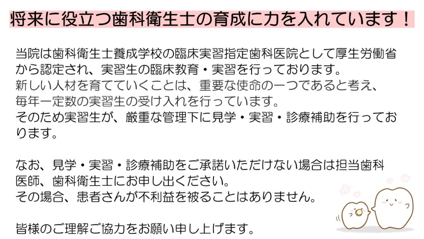 次代を担う優秀な歯科衛生士養成のための定められた教育課程ですので、なにとぞ皆さまのご理解ご協力を賜りますようお願い申し上げます。